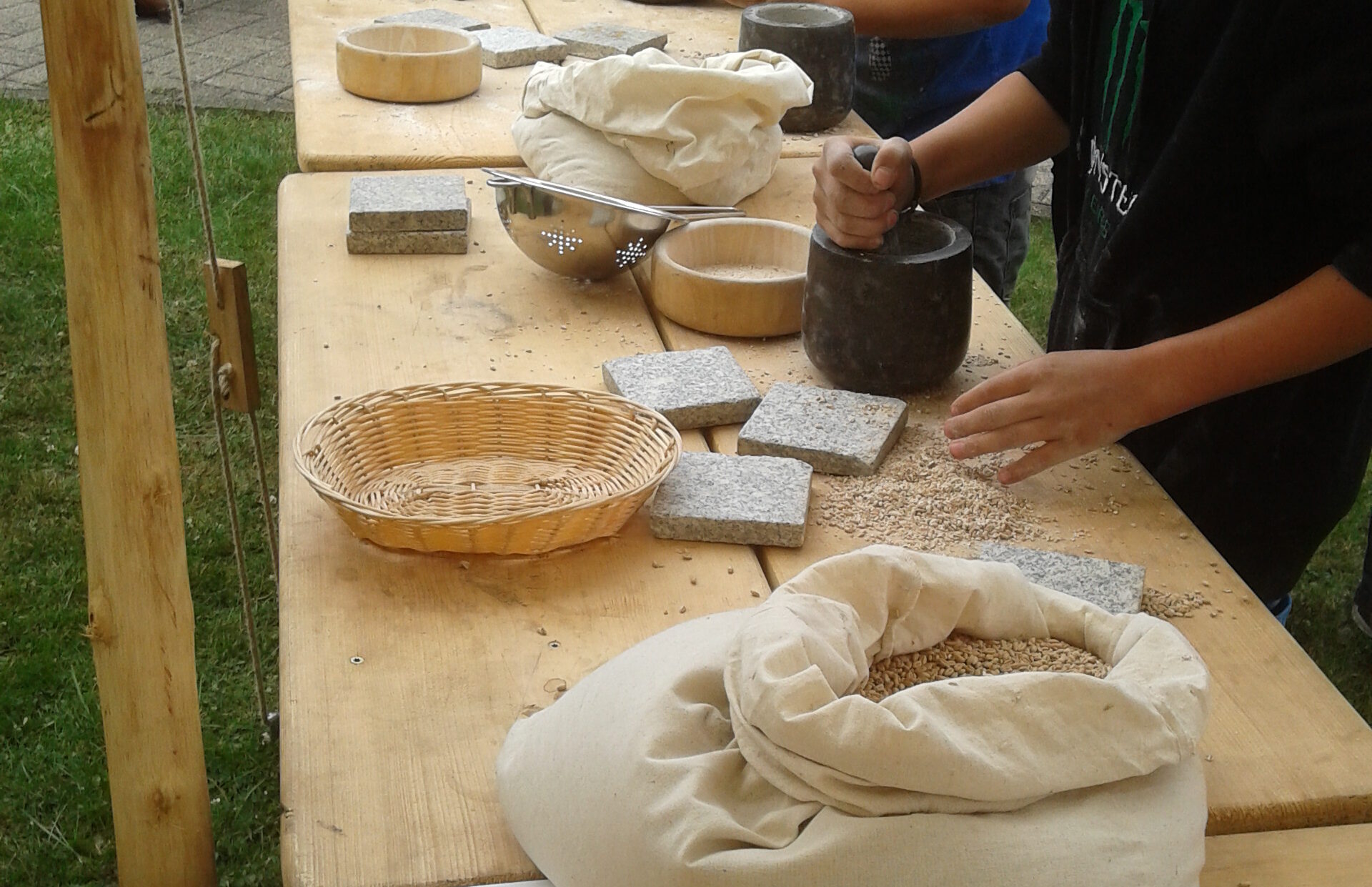 Viele sehen Brot im Haus als selbstverständlich an oder sie mögen es nicht essen. Dennoch gehört Brot zu den Grundnahrungsmitteln der Welt. Lernt die Meilensteine der Brotherstellung kennen und was die schwere Mehlproduktion erleichterte. Was gibt es für Getreidesorten und was an Brot. Mit verschiedenen Techniken können die Teilnehmer Mehl mahlen, um sich anschließend ein eigenes Brot im Holzofen zu backen.
